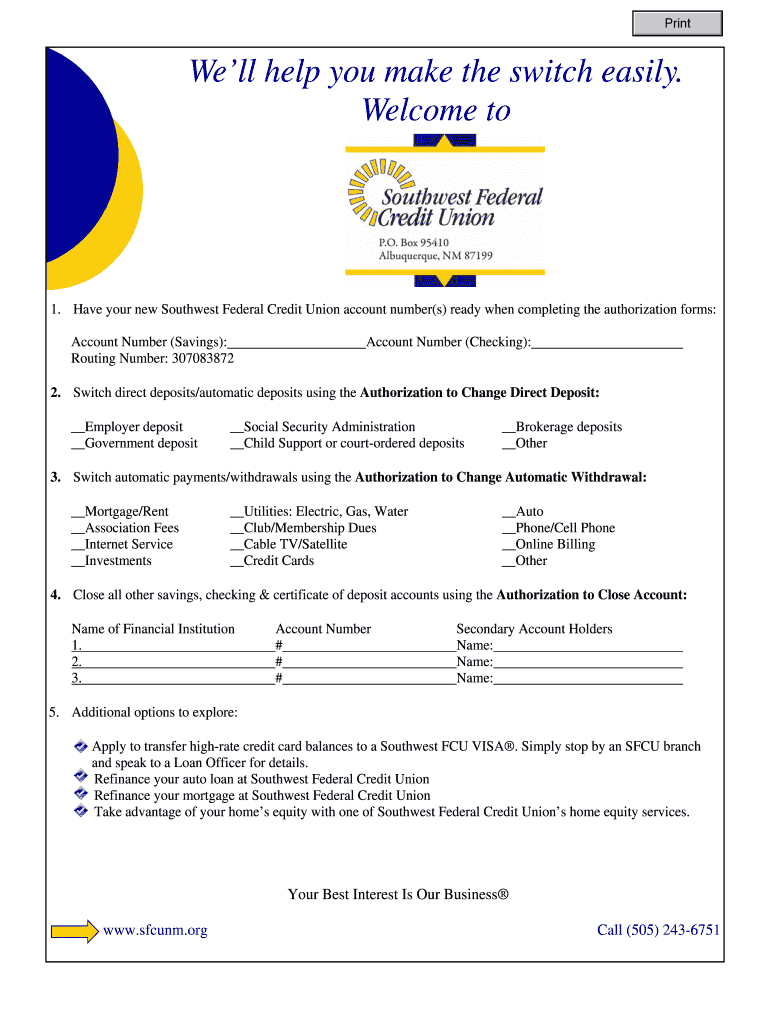 Get the free Southwest Federal Credit Union Account Switch Kit