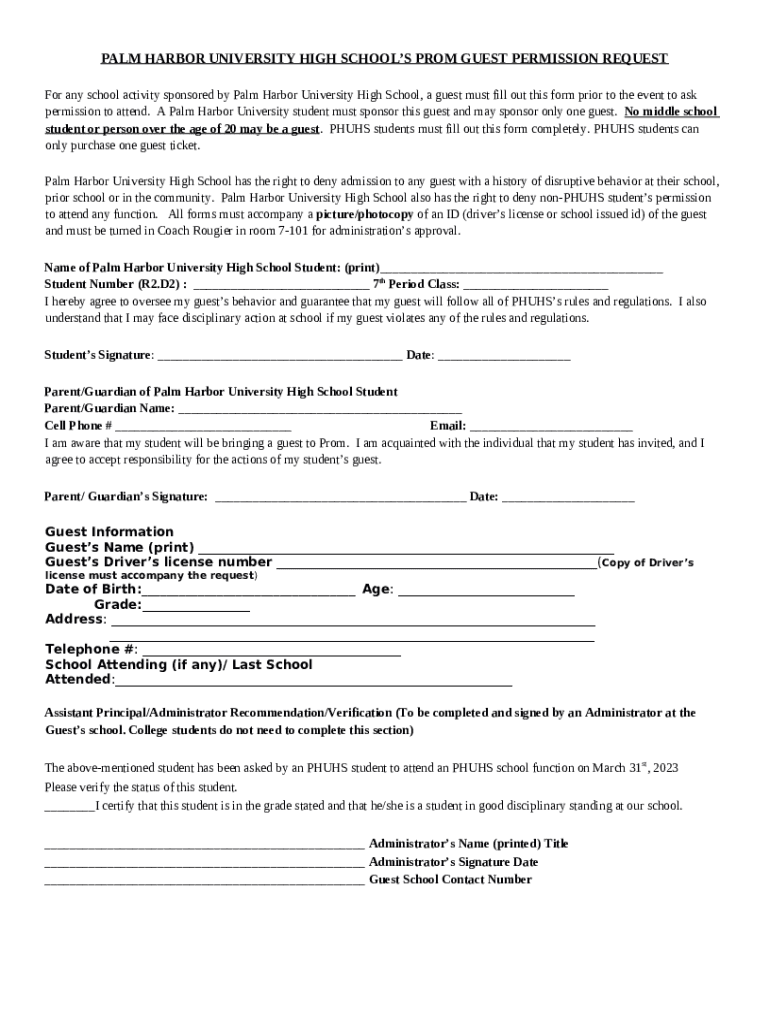 Before starting filling out Prom guest request.docx form, be sure that you prepared enough of required information. That's a important part, as far as some errors can trigger unpleasant consequences from re-submission of the entire blank and filling out with missing deadlines and you might be charged a penalty fee. You have to be observative filling out the digits. At first glance, it might seem to be uncomplicated. However, it is easy to make a mistake. Some people use such lifehack as keeping their records in another file or a record book and then add this into document's template. Nevertheless, try to make all efforts and present actual and solid information with your Prom guest request.docx form, and check it twice during the process of filling out all necessary fields. If you find any mistakes later, you can easily make corrections when working with PDFfiller editing tool and avoid missed deadlines.