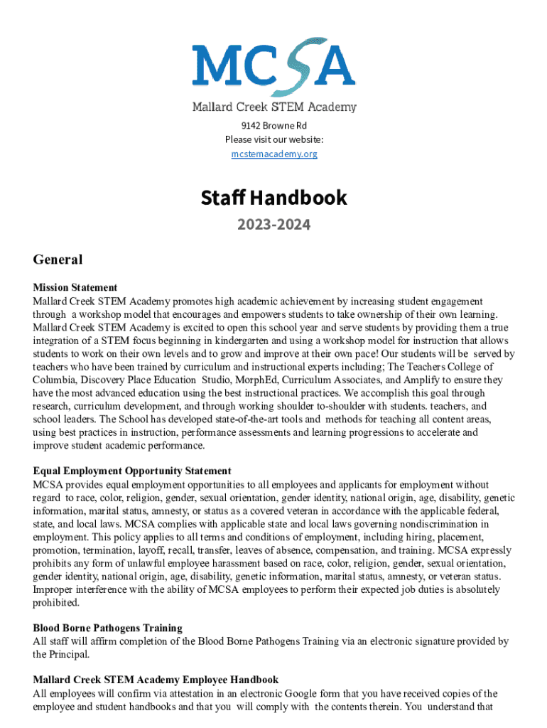 9142 Browne Rd Please visit our website: mcstemacademy.restaff Handbook 20232024 General Mission Statement Mallard Creek STEM Academy promotes high academic achievement by increasing student engagement