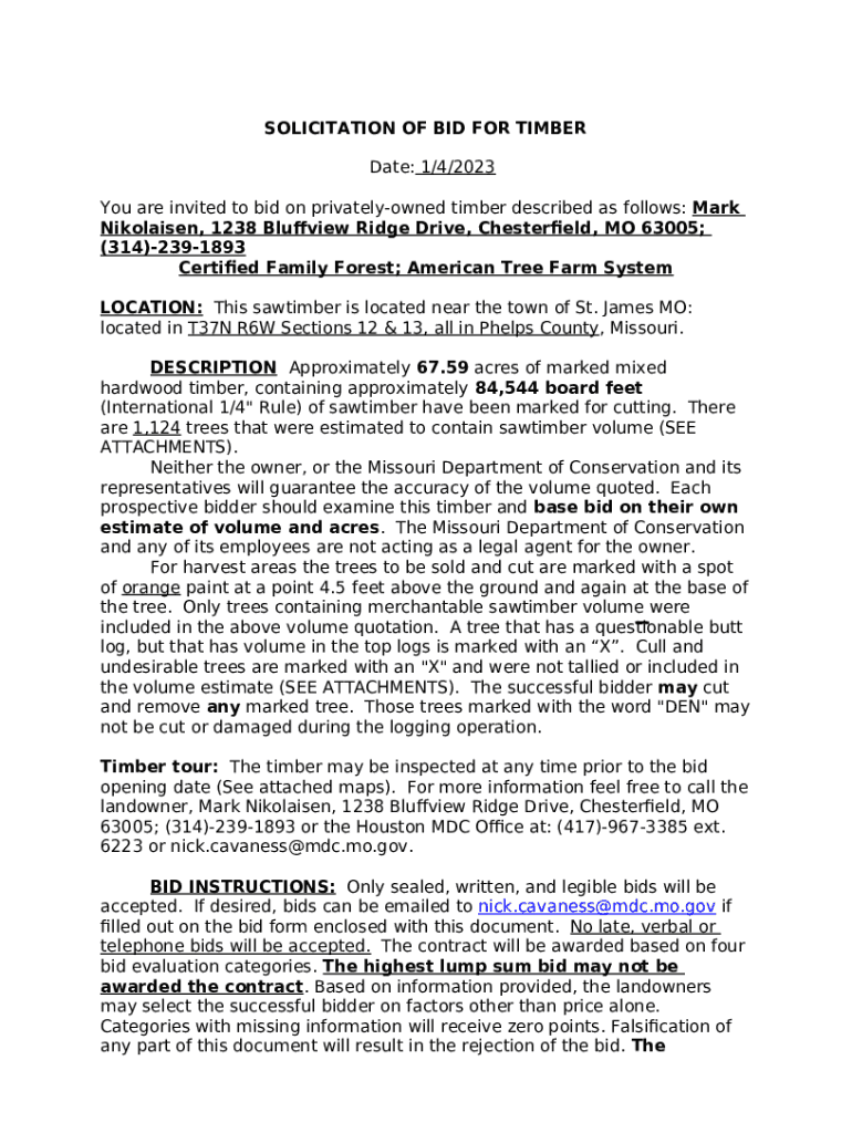You are invited to bid on privately-owned timber described as follows: Mark Nikolaisen, 1238 Bluffview Ridge Drive, Chesterfield, MO 63005; (314)-239-1893 template instructions