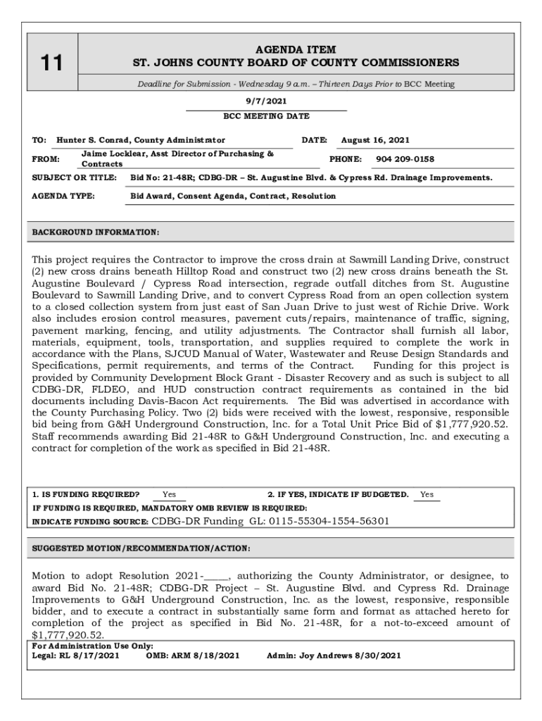 AGENDA ITEM ST. JOHNS COUNTY BOARD OF COUNTY COMMISSIONERS11Deadline for Submission Wednesday 9 a.m. Thirteen Days Prior to BCC Meeting 9/7/2021 BCC MEETING DATE TO:Hunter S. Conrad, County AdministratorFROM:DATE:Jaime