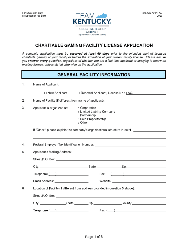For DCG staff only: Application fee paidForm CGAPPFAC 2023CHARITABLE GAMING FACILITY LICENSE APPLICATION A complete application must be received at least 60 days prior to the intended start of licensed