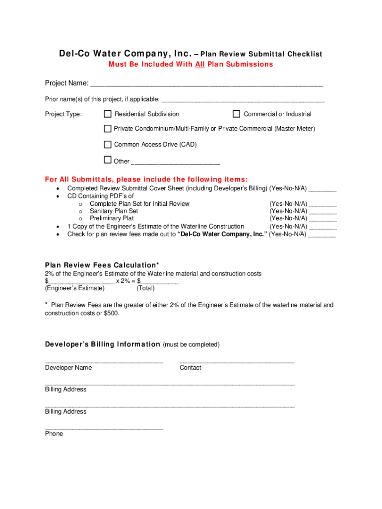Del Co Water Company, Inc. Plan Review Submittal Checklist Must Be Included With All Plan Submissions Project Name: ___ Prior name(s) of this project, if applicable: ___ Project Type: Residential