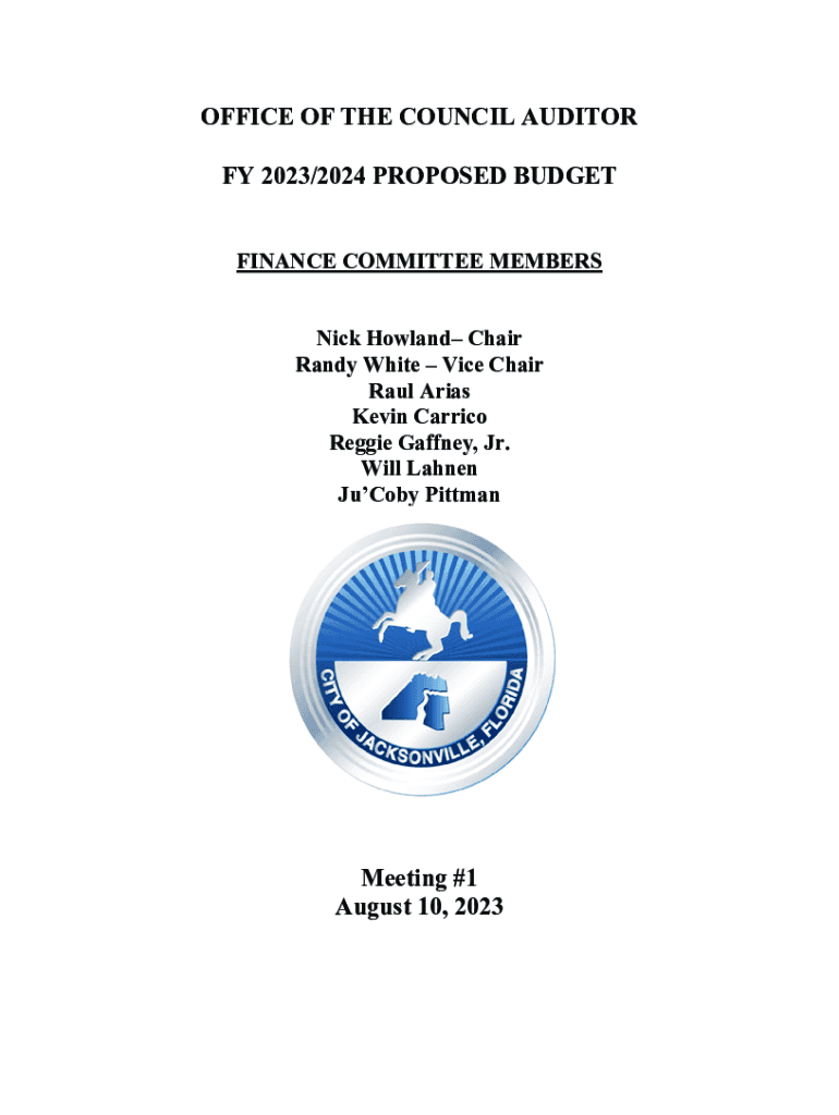 OFFICE OF THE COUNCIL AUDITOR FY 2023/2024 PROPOSED BUDGET FINANCE COMMITTEE MEMBERS Nick Howland Chair Randy White Vice Chair Raul Arias Kevin Carried Reggie Galena, Jr. Will Lane Jacoby PittmanMeeting