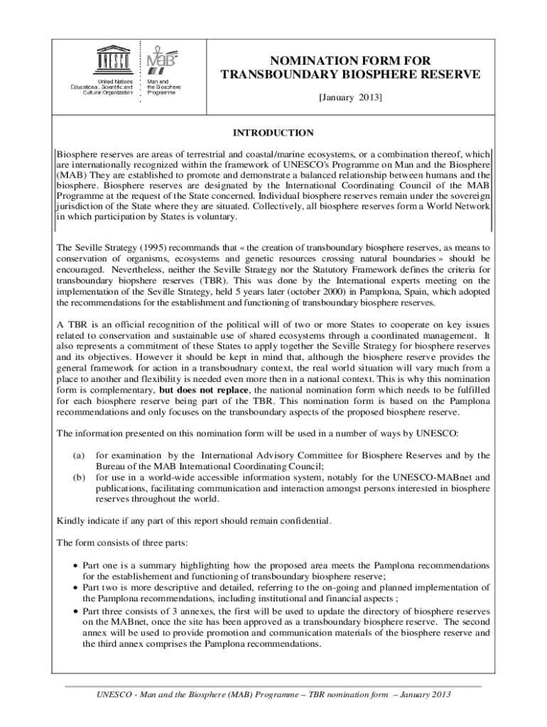 Get the free Nomination Form For Transboundary Biosphere Reserve - ...