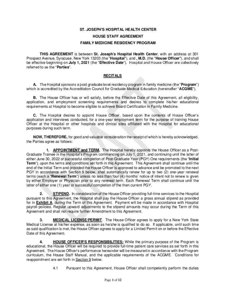 ST. JOSEPH\'S HOSPITAL HEALTH CENTER HOUSE STAFF AGREEMENT FAMILY MEDICINE RESIDENCY PROGRAM THIS AGREEMENT is between St. Joseph\'s Hospital Health Center, with an address at 301 Prospect Avenue,