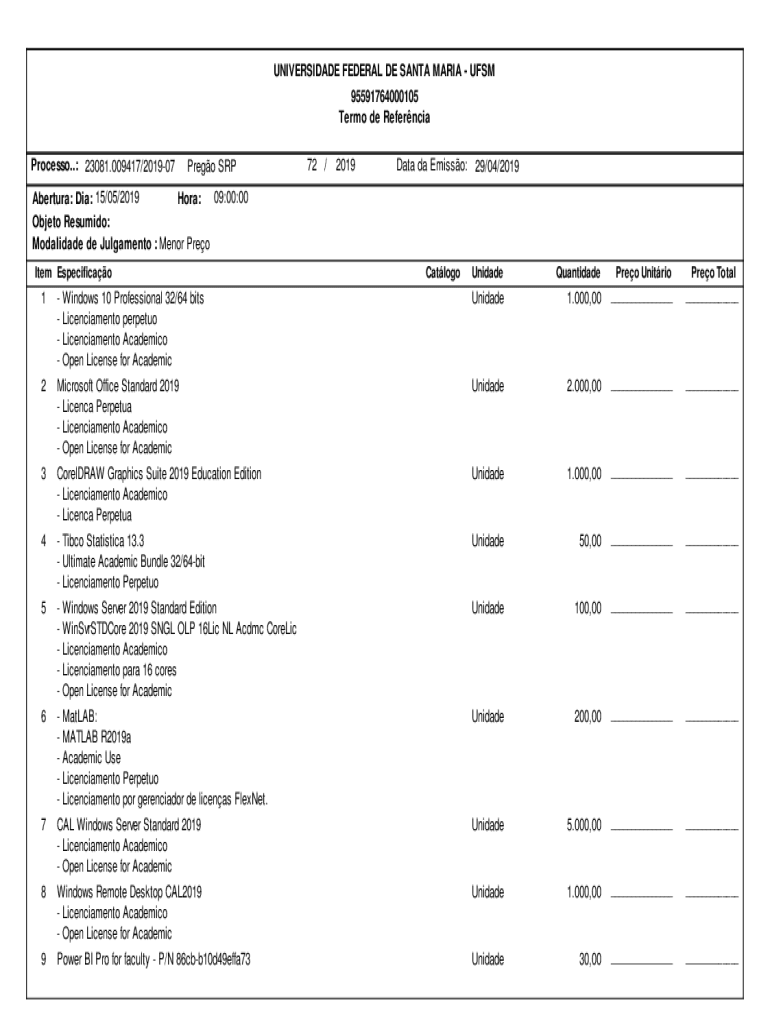 UNIVERSIDADE FEDERAL DE SANTA MARIA UFSM 95591764000105 Termo de Referncia Processo..: 23081.009417/201907Prego SRP72 /2019Data da Emisso: 29/04/2019Abertura: Dia: 15/05/2019 Hora: 09:00:00 Objeto