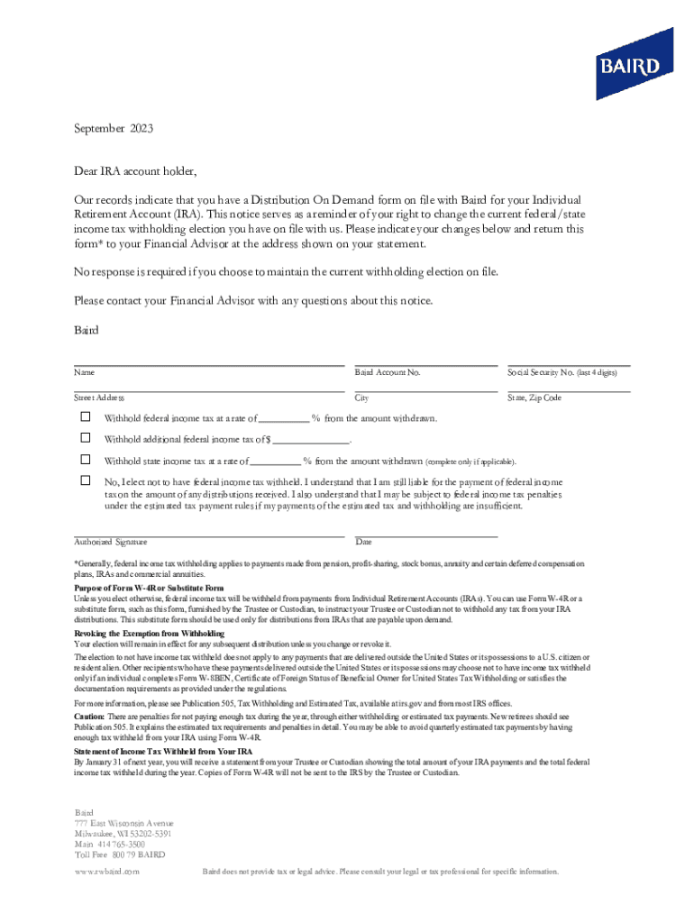 September 2023 Dear IRA account holder, Our records indicate that you have a Distribution On Demand form on file with Baird for your Individual Retirement Account (IRA). This notice serves as a reminder