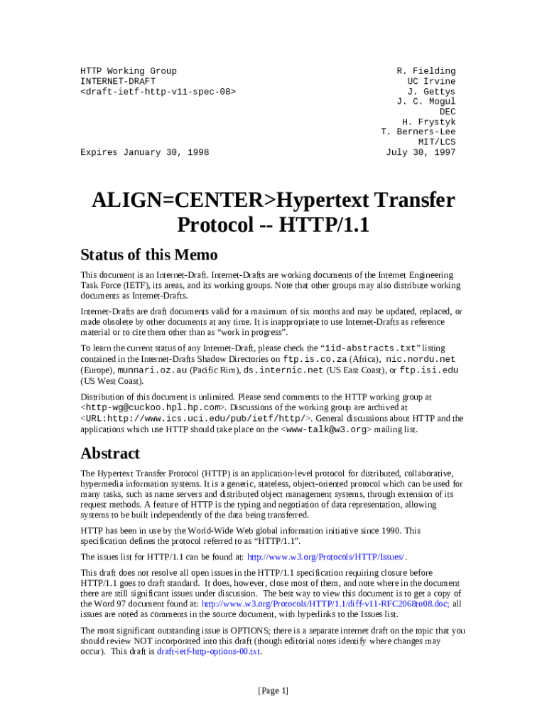 The 2068 UC Irvine Category: Standards Track J. Gettys J. Mogul is a document that has to be completed and signed for certain reasons. Next, it is furnished to the actual addressee in order to provide some details of any kinds. The completion and signing can be done manually in hard copy or via an appropriate application e. g. PDFfiller. Such tools help to submit any PDF or Word file online. It also allows you to edit its appearance depending on the needs you have and put an official legal electronic signature. Once finished, the user sends the 2068 UC Irvine Category: Standards Track J. Gettys J. Mogul to the respective recipient or several recipients by mail and also fax. PDFfiller provides a feature and options that make your blank printable. It includes various settings for printing out. It doesn't matter how you will distribute a form after filling it out - in hard copy or by email - it will always look neat and firm. To not to create a new editable template from scratch every time, turn the original document into a template. After that, you will have a customizable sample.