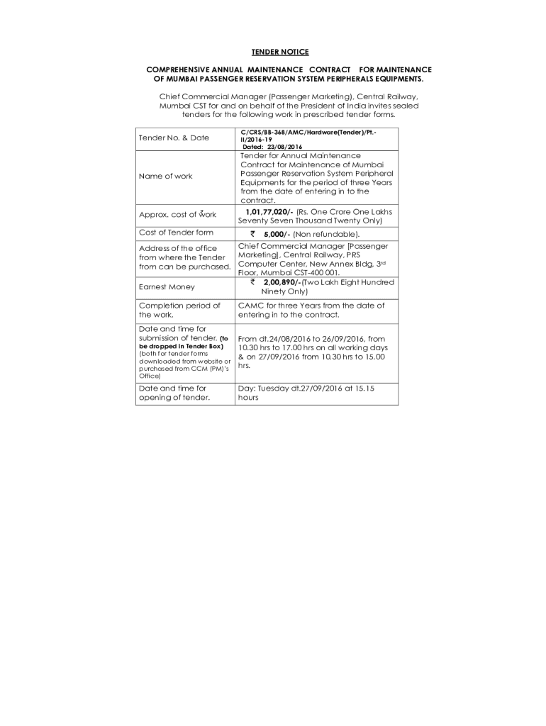 TENDER NOTICE COMPREHENSIVE ANNUAL MAINTENANCE CONTRACT FOR MAINTENANCE OF MUMBAI PASSENGER RESERVATION SYSTEM PERIPHERALS EQUIPMENTS. Chief Commercial Manager (Passenger Marketing), Central Railway,