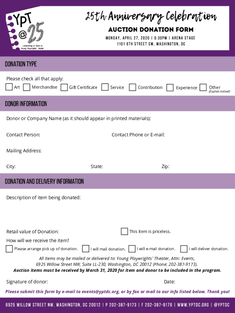 25th Anniversary Celebration AUCTION DONATION FORMMonday, April 27, 2020 | 6:30pm | Arena Stage 1101 6th Street SW, Washington, DCDONATION TYPE Please check all that apply: ArtMerchandiseGift CertificateServiceContributionExperienceOther(Explain