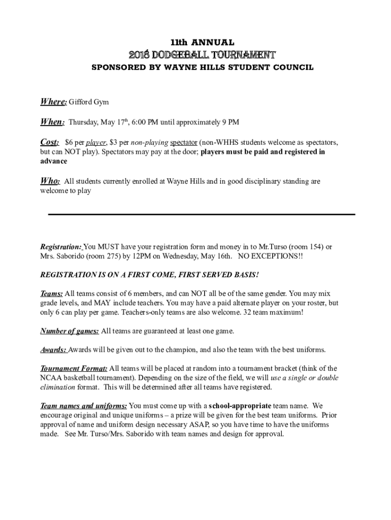 11th ANNUAL 2018 DODGEBALL TOURNAMENT SPONSORED BY WAYNE HILLS STUDENT Councilwoman: Gifford Gym When: Thursday, May 17th, 6:00 PM until approximately 9 PM Cost: $6 per player, $3 per nonpaying spectator