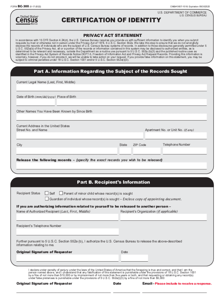 U.S. Department of Commerce Form BC300 Certication of IdentityOMB# 06071018 Expiration 09/30/2025Purpose: The primary purpose for providing the requested information on this form is for parties to