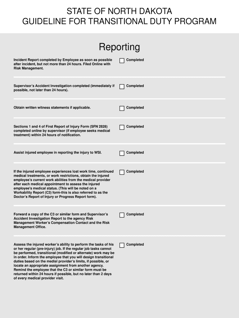 STATE OF NORTH DAKOTA GUIDELINE FOR TRANSITIONAL DUTY PROGRAM Reporting Incident Report completed by Employee as soon as possible after incident, but not more than 24 hours. Filed Online with Risk