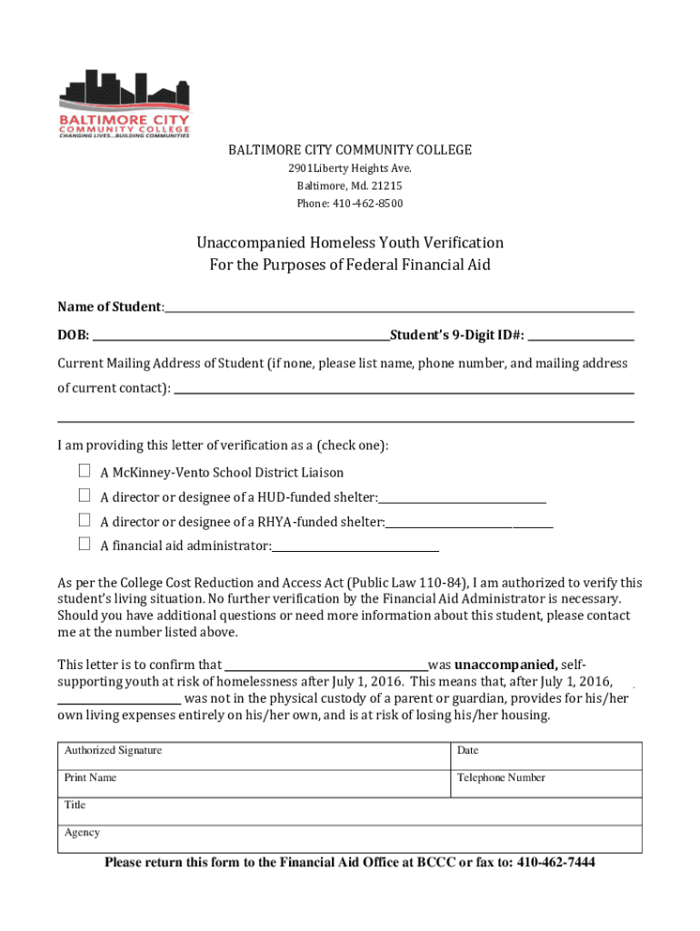 BALTIMORE CITY COMMUNITY COLLEGE 2901Liberty Heights Ave. Baltimore, Md. 21215 Phone: 4104628500Unaccompanied Homeless Youth Verification For the Purposes of Federal Financial Aid Name of Student: