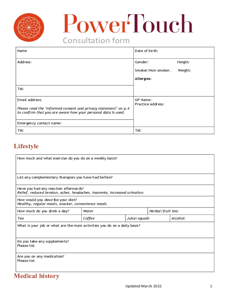 Consultation form NameD ate of birth:Address:Gender:Height:Smoker/Nonsmoker. Weight:Allergies: Tel: Email address: Please read the Informed consent and privacy statement on p.4 to confirm that you
