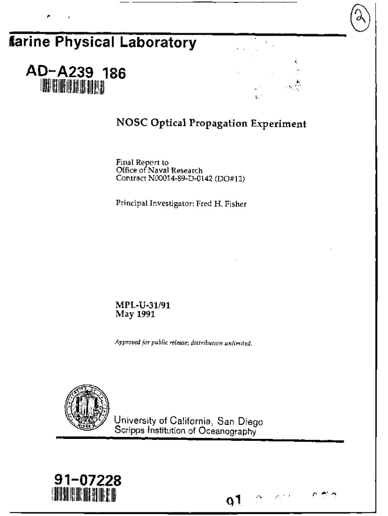 Marine Physical Laboratory ADA239 186NOSC Optical Propagation Experimental Report to Office of Naval Research Contract N0001489D0142 (DO#12) Principal Investigator: Fred H. FisherMPLU31/91 May 1991