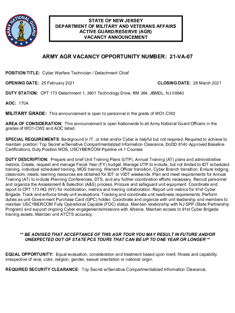 STATE OF NEW JERSEY DEPARTMENT OF MILITARY AND VETERANS AFFAIRS ACTIVE GUARD/RESERVE (AGR) VACANCY ANNOUNCEMENT ARMY AGR VACANCY OPPORTUNITY NUMBER: 21VA07 POSITION TITLE: Cyber Warfare Technician