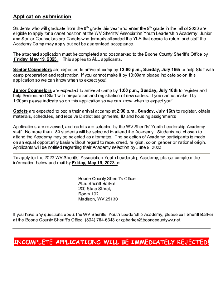 WEST VIRGINIA SHERIFFS$662&,$7.21 YOUTH LEADERSHIP ACADEMY Application Packet For Cadets, Senior & Junior Counselors *OHQYLOOH6WDWH8QLYHUVLW TO The West Virginia Sheriffs Association Youth Leadership