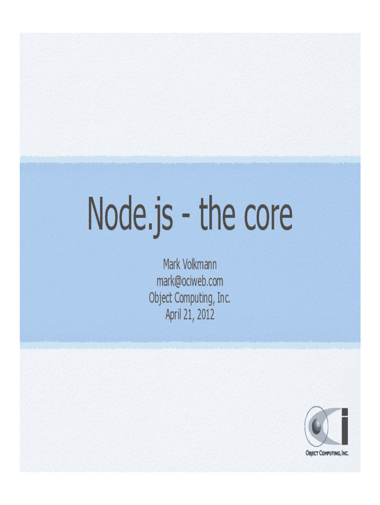 Node.js the core Mark Volkmar mark@ociweb.com Object Computing, Inc. April 21, 2012Overview ... Node\'s goal is to provide an easy way to build scalable network programs. http://nodejs.org/#aboutA
