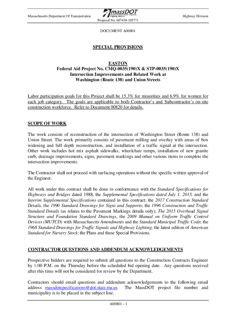 Massachusetts Department Of TransportationHighway Division Proposal No. 607438105771DOCUMENT A00801SPECIAL PROVISIONSEASTON Federal Aid Project No. CMQ0035(190)X & STP0035(190)X Intersection Improvements