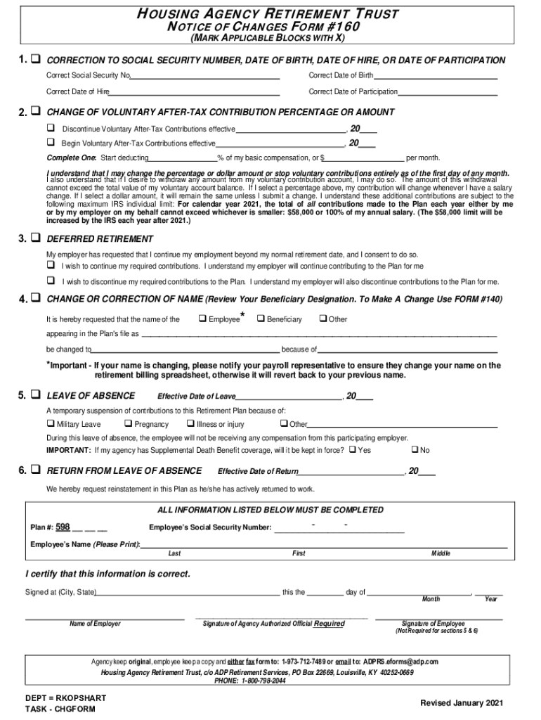 HOUSING AGENCY RETIREMENT TRUST NOTICE OF CHANGES FORM #160 (MARK APPLICABLE BLOCKS WITH X)1. CORRECTION TO SOCIAL SECURITY NUMBER, DATE OF BIRTH, DATE OF HIRE, OR DATE OF PARTICIPATION Correct Social