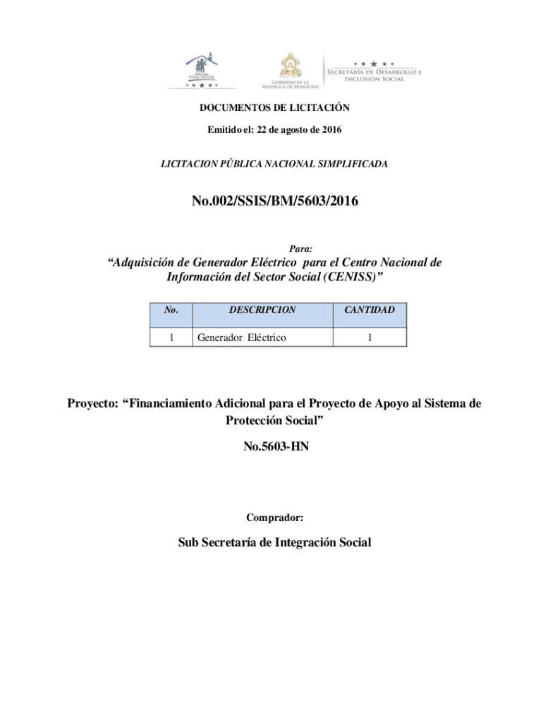 DOCUMENTS DE LIMITATION Emilio El: 22 de Acosta de 2016 LIMITATION PBL ICA NATIONAL SIMPLIFICADANo.002/SSIS/BM/5603/2016Para:Adquisicin de Generador Electric para el CENTR Nacional de Informacin Del