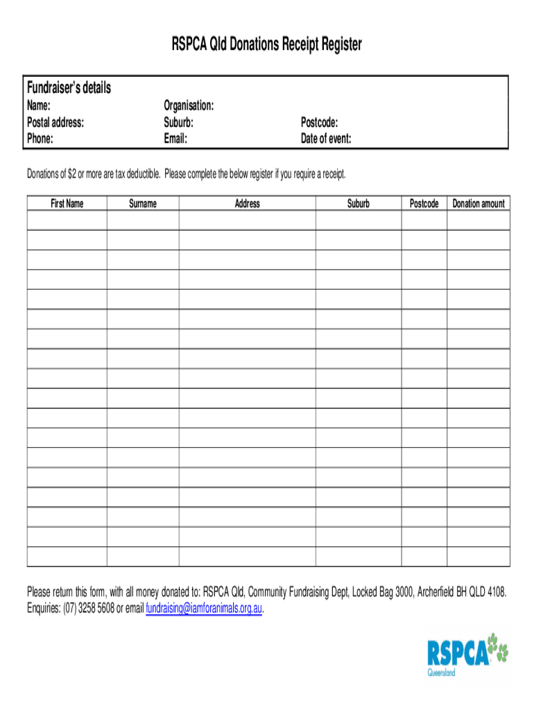 ASPCA QLD Donations Receipt Register Fundraisers details Name: Postal address: Phone:Organization: Suburb: Email:Postcode: Date of event:Donations of $2 or more are tax-deductible. Please complete
