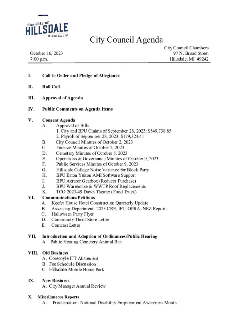 Finance Minutes 91823.paucity Council Agenda October 16, 2023 7:00 p.m. City Council Chambers 97 N. Broad Street Hillsdale, MI 49242I. Call to Order and Pledge of Allegiance. Roll Calling. Approval
