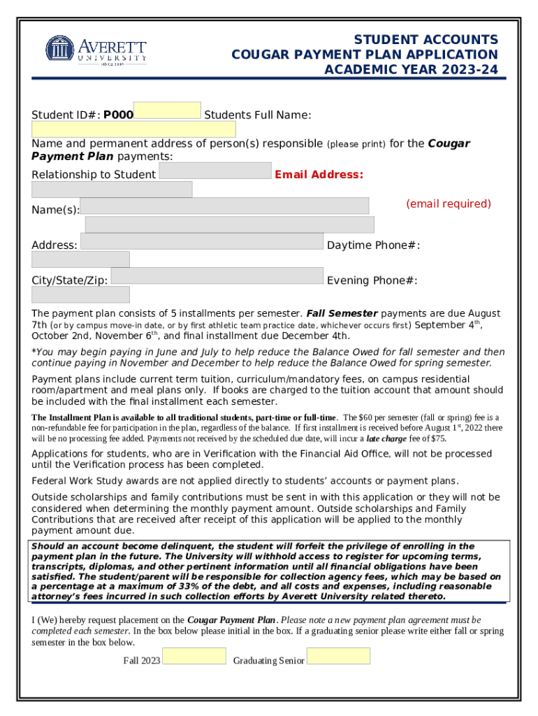 The Monthly Payment Plan - Student Services Center is a Word document required to be submitted to the specific address in order to provide specific info. It has to be filled-out and signed, which may be done manually, or with the help of a particular solution such as PDFfiller. This tool lets you fill out any PDF or Word document directly from your browser (no software requred), customize it according to your needs and put a legally-binding e-signature. Right after completion, user can easily send the Monthly Payment Plan - Student Services Center to the relevant recipient, or multiple individuals via email or fax. The template is printable as well thanks to PDFfiller feature and options offered for printing out adjustment. Both in electronic and physical appearance, your form will have got clean and professional outlook. It's also possible to save it as the template for later, so you don't need to create a new blank form over and over. All you need to do is to edit the ready template.