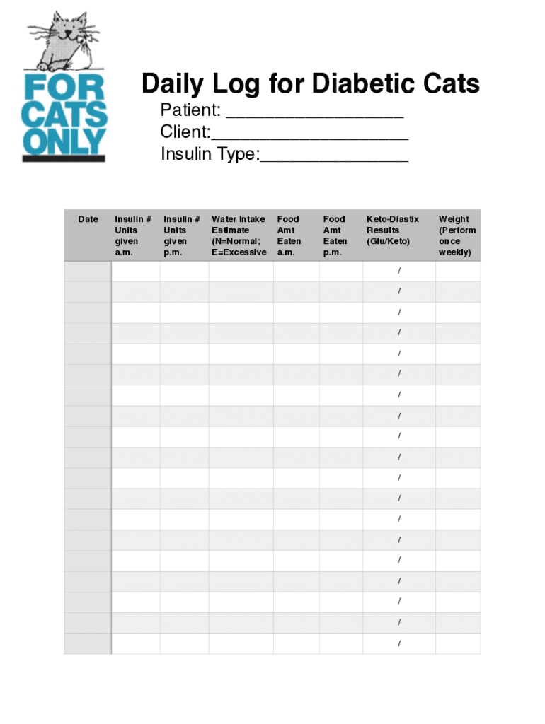 Daily Log for Diabetic Cats Patient: ___ Client:___ Type:___DateInsulin # Units given a.m. # Units given p.m.Water Intake Estimate (NNormal; EExcessiveFood Amt Eaten a.m.Food Amt Eaten p.m.KetoDiastix