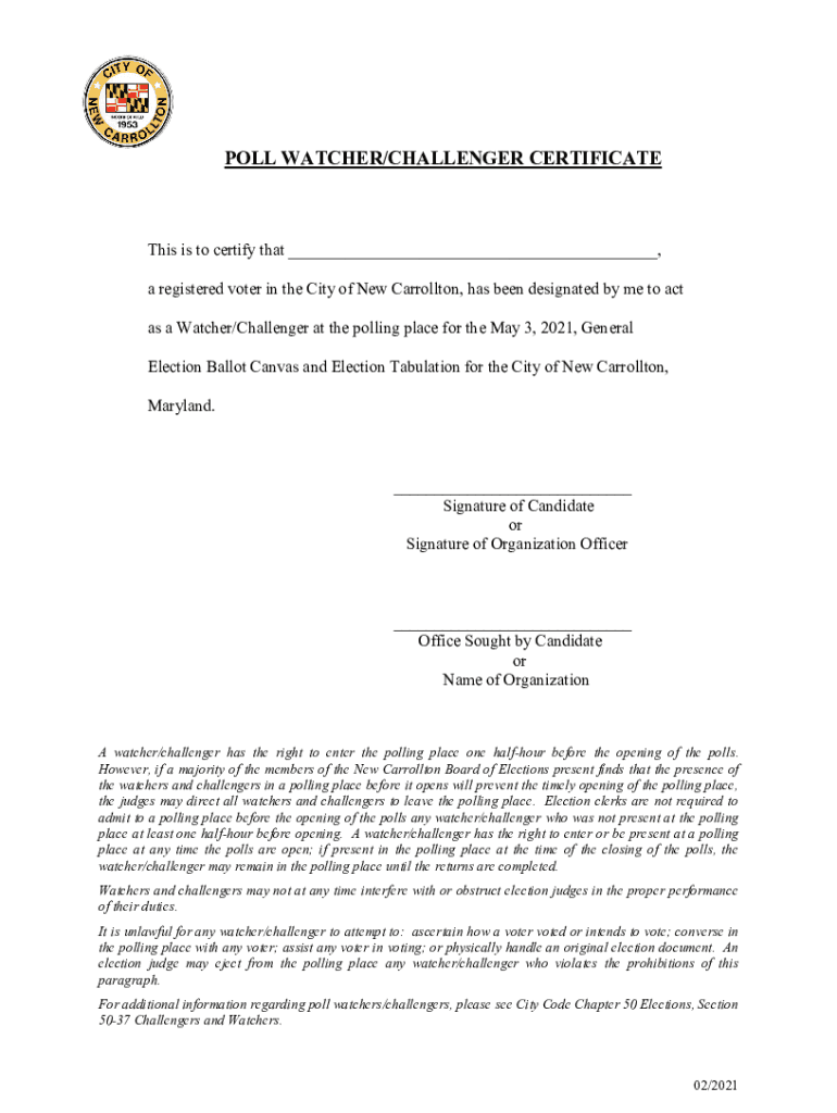 POLL WATCHER/CHALLENGER CERTIFICATEThis is to certify that ___, a registered voter in the City of New Carrollton, has been designated by me to act as a Watcher/Challenger at the polling place for