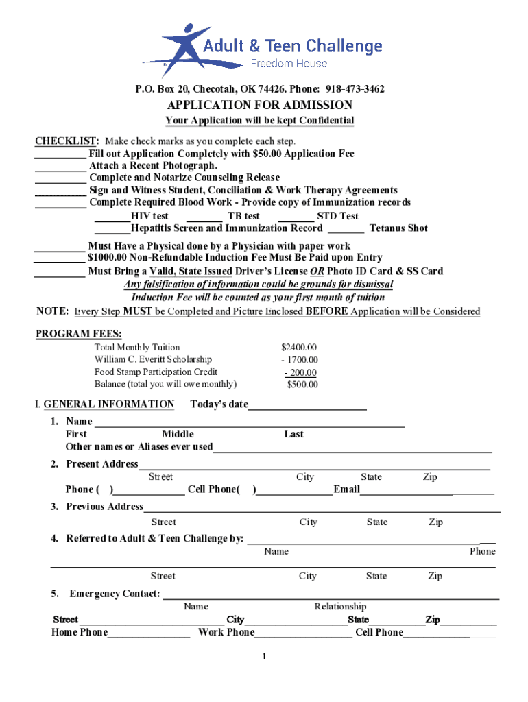 P.O. Box 20, Checotah, OK 74426. Phone: 9184733462APPLICATION FOR ADMISSION Your Application will be kept Confidential CHECKLIST: Make check marks as you complete each step. ___ Fill out Application