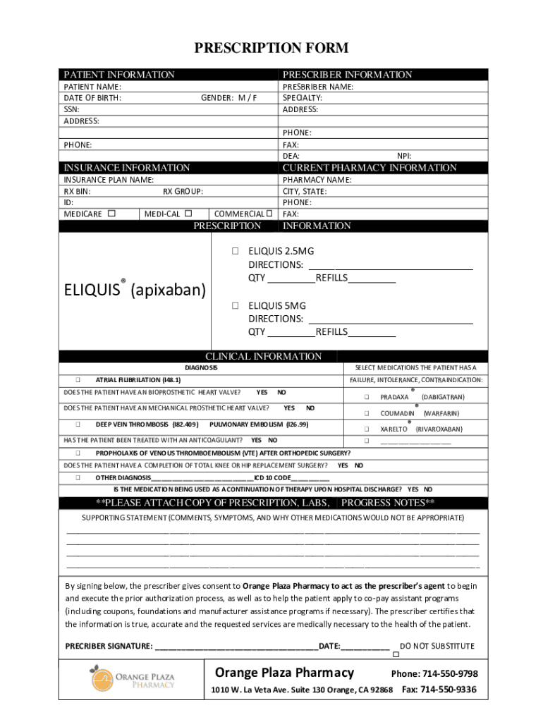 PRESCRIPTION FORM PATIENT INFORMATIONPRESCRIBER INFORMATIONPATIENT NAME: DATE OF BIRTH: SSN: ADDRESS:PRESCRIBER NAME: SPECIALTY: ADDRESS:GENDER: M / PHONE:PHONE: FAX: DEA:INSURANCE INFORMATIONCURRENT