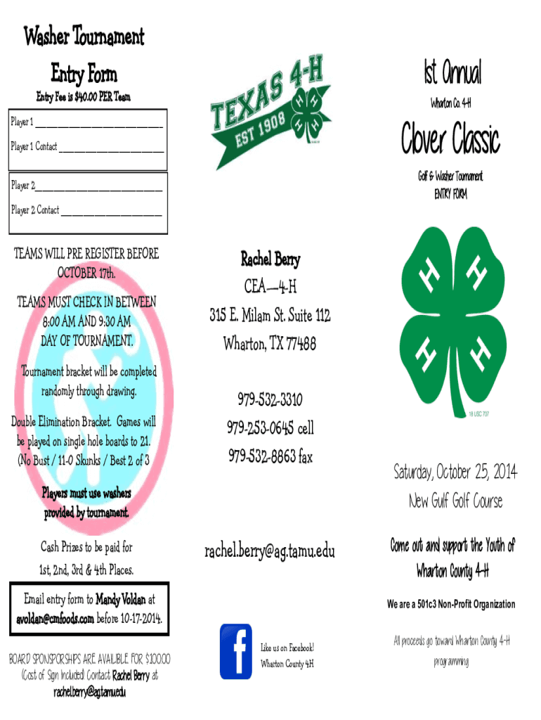 Entry Form1st AnnualEntry Fee is $40.00 PER Team Wharton Co. 4HPlayer 1 ___Clover ClassicPlayer 1 Contact ___Golf & Washer TournamentPlayer 2___ENTRY Formulated 2 Contact ___TEAMS