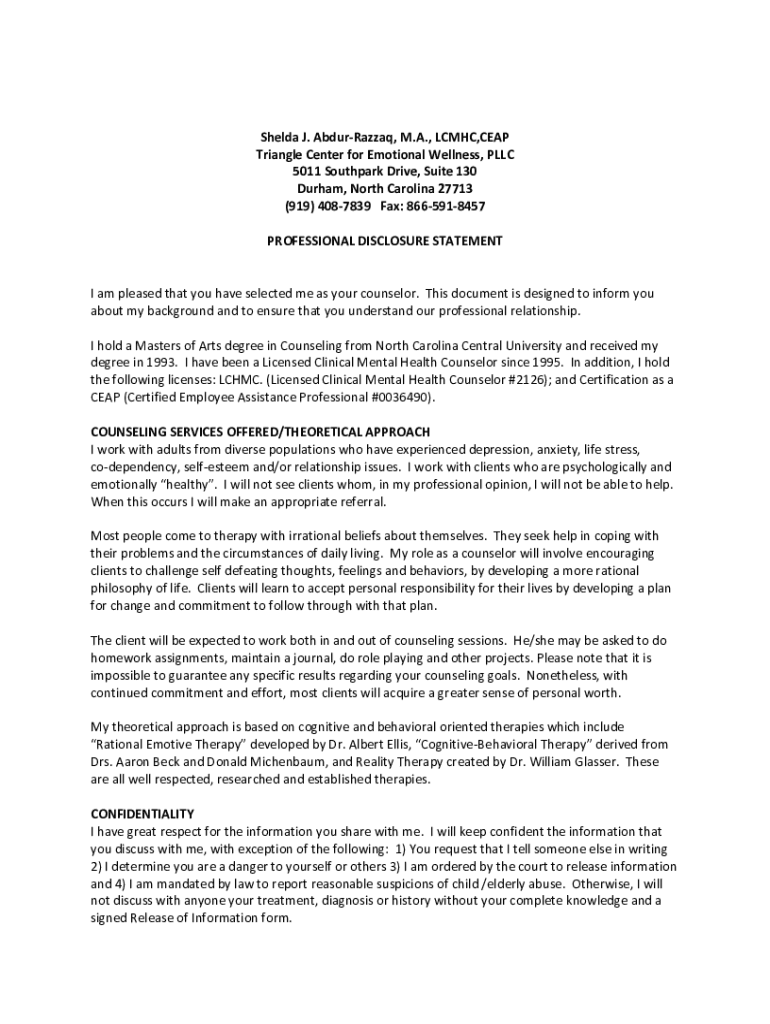 Shelia J. Abdurrahman, M.A., LC MHC, CEAP Triangle Center for Emotional Wellness, LLC 5011 South park Drive, Suite 130 Durham, North Carolina 27713 (919) 4087839 Fax: 8665918457 PROFESSIONAL DISCLOSURE