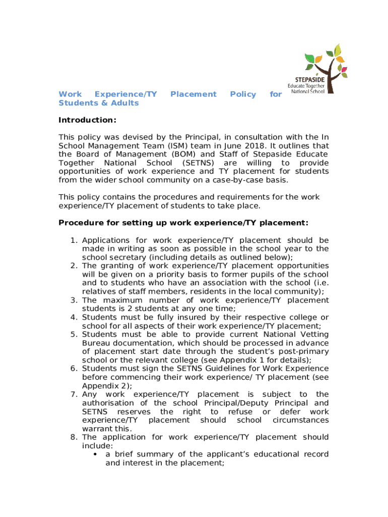 Template POLICY FOR TRANSITION YEAR WORK EXPERIENCE instructions
