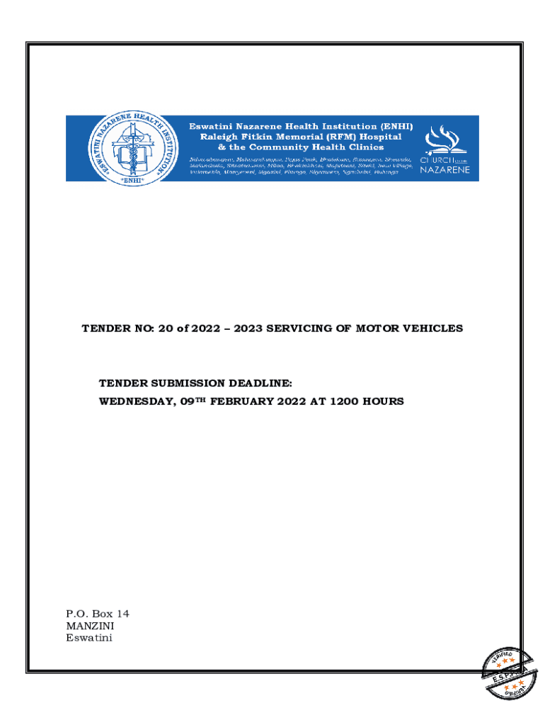 TENDER NO: 20 of 2022 2023 SERVICING OF MOTOR VEHICLESTENDER SUBMISSION DEADLINE: WEDNESDAY, 09TH FEBRUARY 2022 AT 1200 HOURS. O. Box 14 MANCINI EswatiniTABLE OF CONTENTS 1. PREAMBLE .............................................