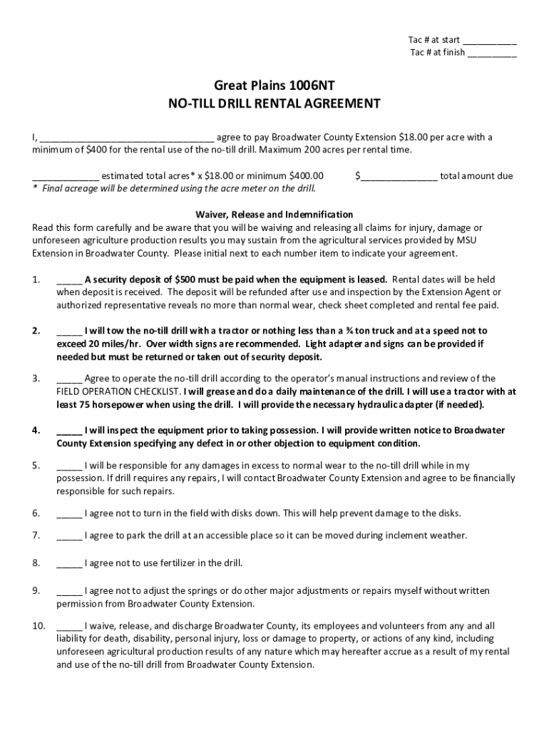 TAC # at start ___ TAC # at finish ___Great Plains 1006NT STILL DRILL RENTAL AGREEMENT I, ___ agree to pay Broad water County Extension $18.00 per acre with a minimum of $400 for the rental use of
