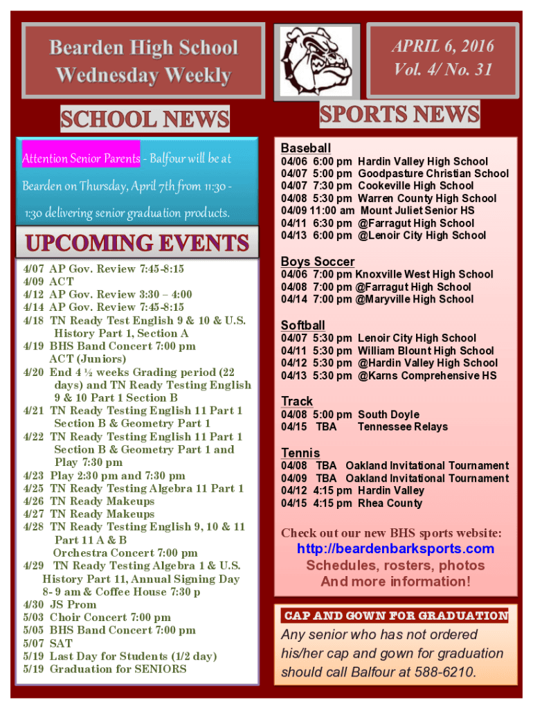 APRIL 6, 2016Vol. 4/ No. 31Attention Senior Parents Balfour will be at Bearded on Thursday, April 7th from 11:30 1:30 delivering senior graduation products. 4/07 4/09 4/12 4/14 4/18AP Gov. Review