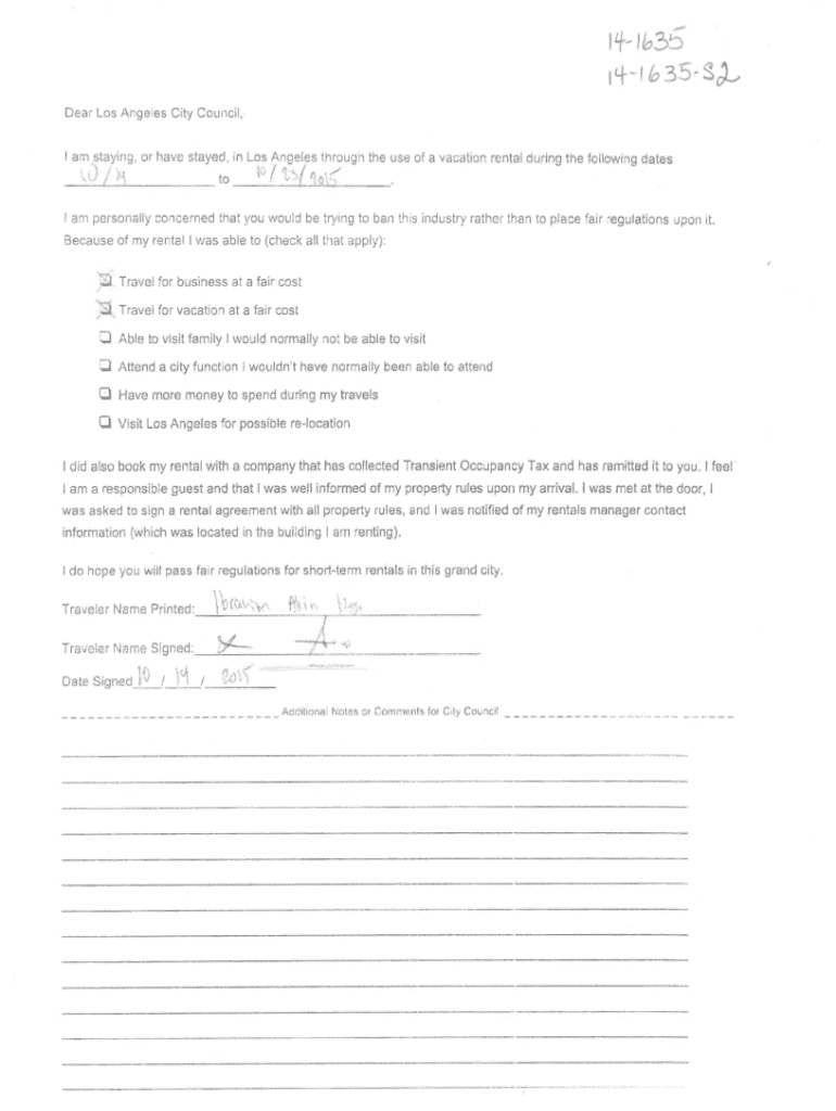 141635 141635Dear Los Angeles City Council, I am staying, or have stayed, in ___tolosAngeles through the use of a vacation rental during the following dates/tow. I am personally concerned that you