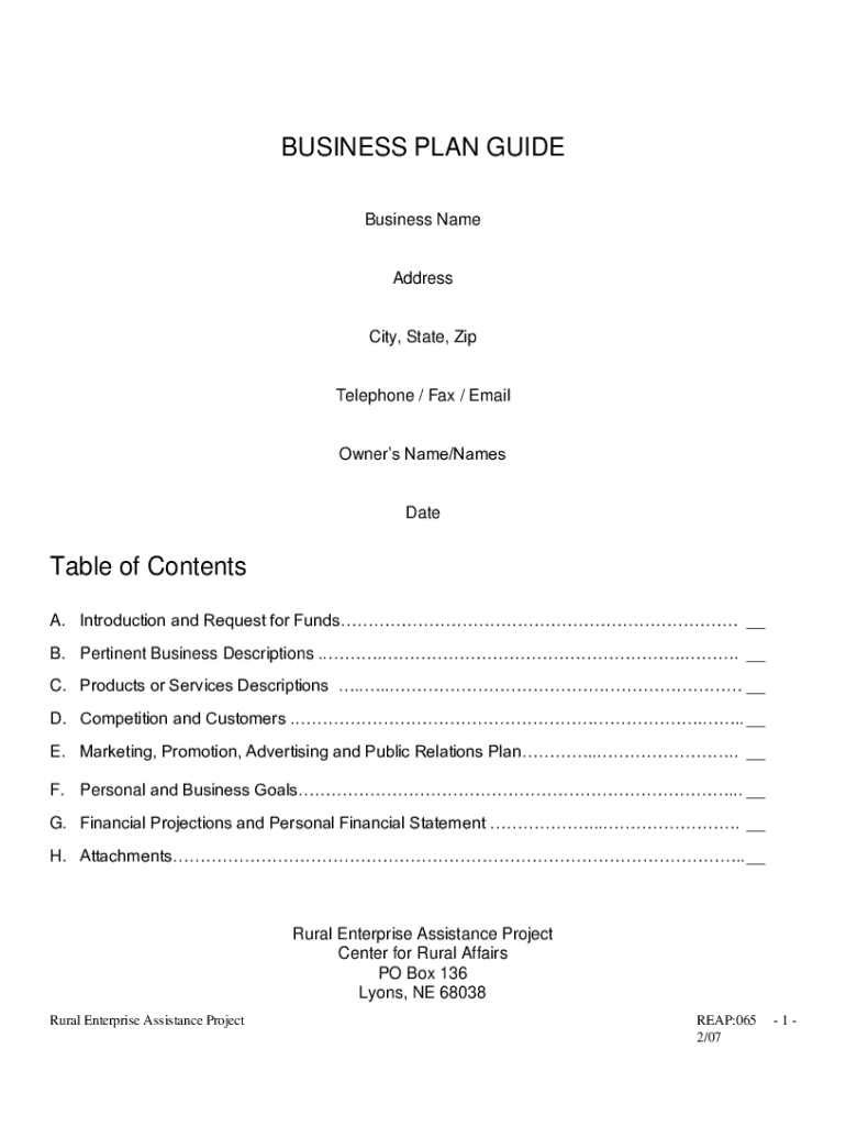 BUSINESS PLAN GUIDE Business NameAddressCity, State, ZipTelephone / Fax / Email Owners Name/NamesDateTable of Contents A. Introduction and Request for Funds __ B. Pertinent Business Descriptions .....