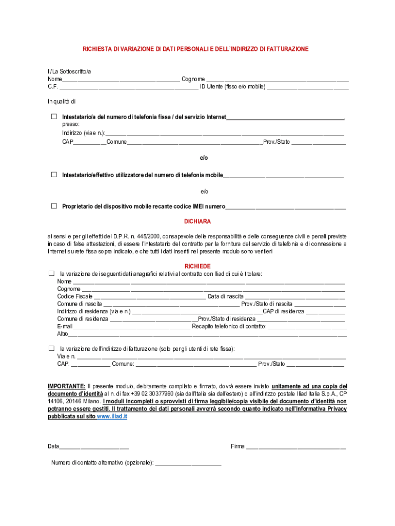 RICHEST DI VARIATION DID ATI PERSONAL E DELLINDIRIZZO DI FATTURAZIONE IL/La Sottoscritto/a Nome___ Cognomen ___ C.F. ___ ID Tenth (first e/o mobile) ___ In quality DI Intestatario/a Del number DI