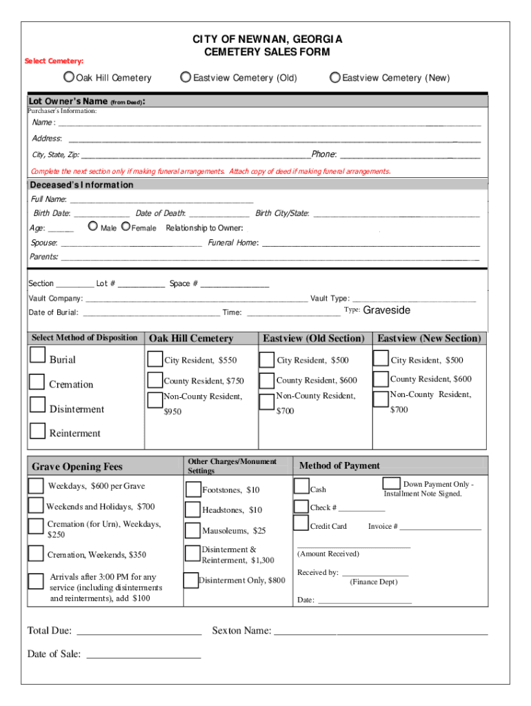 Get the free city of newnan, georgia cemetery sales form