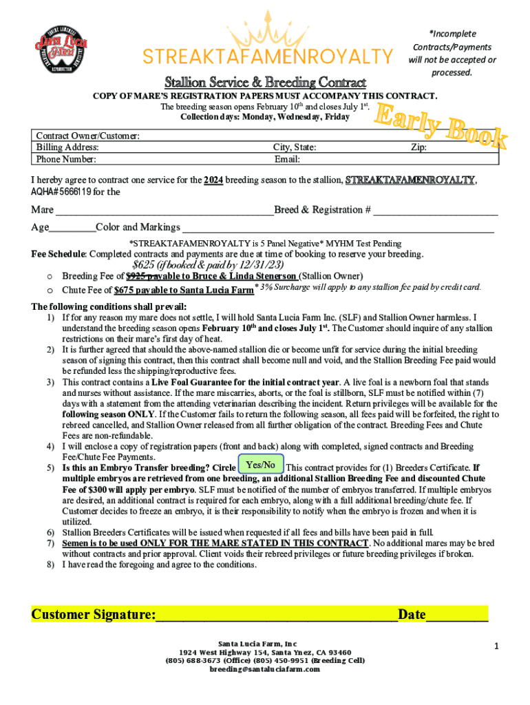 Stallion Service & Breeding Contract*Incomplete Contracts/Payments will not be accepted or processed.COPY OF MARES REGISTRATION PAPERS MUST ACCOMPANY THIS CONTRACT. The breeding season opens February