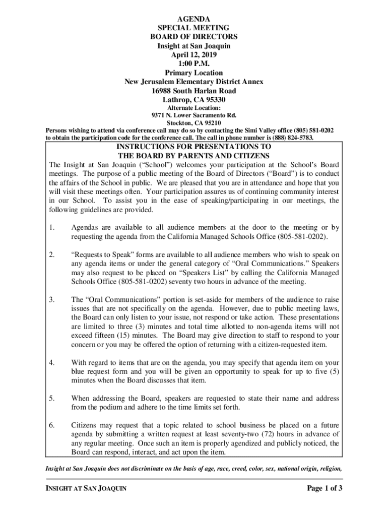 AGENDA SPECIAL MEETING BOARD OF DIRECTORS Insight at San Joaquin April 12, 2019 1:00 P.M. Primary Location New Jerusalem Elementary District Annex 16988 South Harlan Road Lathrop, CA 95330 Alternate
