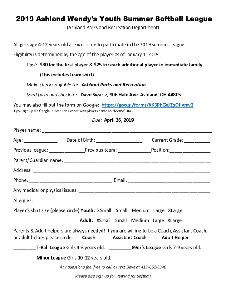 2019 Ashland Wendys Youth Summer Softball League (Ashland Parks and Recreation Department) All girls age 412 years old are welcome to participate in the 2019 summer league. Eligibility is determined