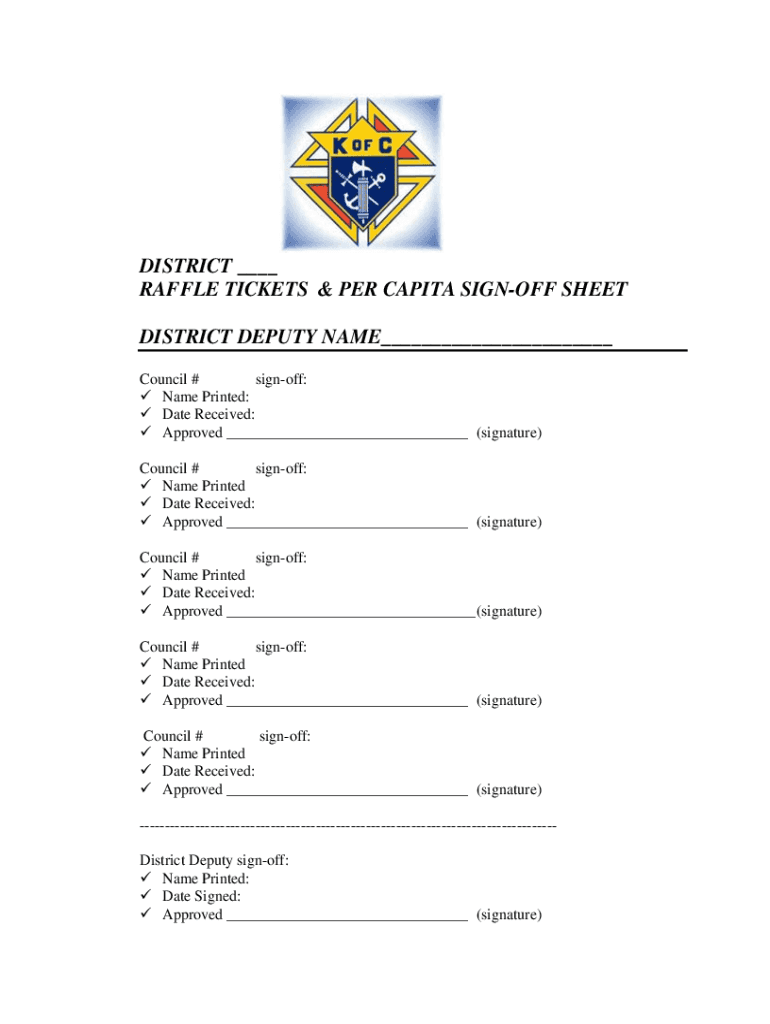 DISTRICT ___ RAFFLE TICKETS & PER CAPITA SIGN-OFF SHEET DISTRICT DEPUTY NAME___ Council # sign off: Name Printed: Date Received: Approved ___ (signature) Council # sign off: Name Printed Date Received: