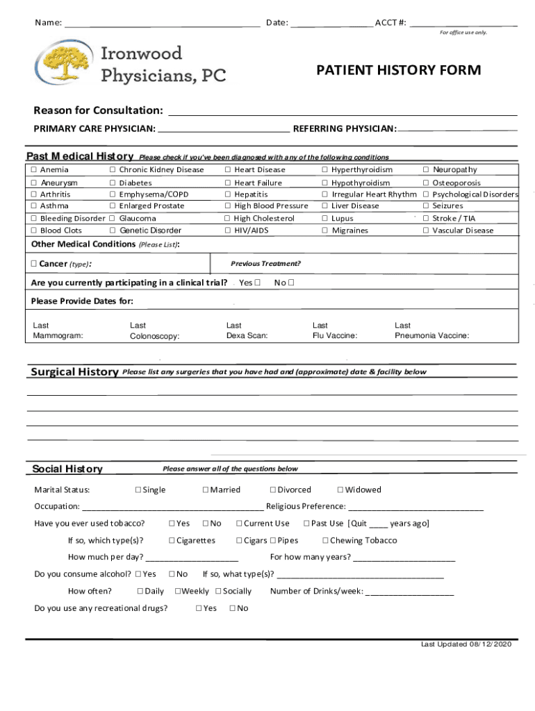 Name:Date:ACCT #: For office use only. PATIENT HISTORY FORM Reason for Consultation: ___ PRIMARY CARE PHYSICIAN:Past Medical HistoryREFERRING PHYSICIAN:Please check if you\'ve been diagnosed with