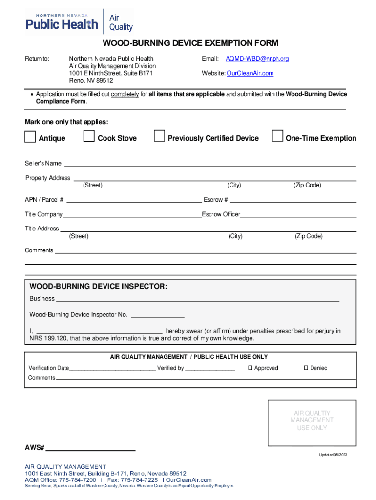 WOODWORKING DEVICE EXEMPTION FORM Return to:Northern Nevada Public Health Air Quality Management Division 1001 E Ninth Street, Suite B171 Reno, NV 89512Email:AQMDWBD@nnph.website: OurCleanAir.com